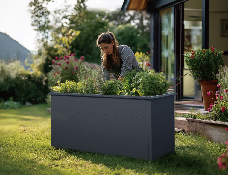 Hochbeet XL aus pulverbeschichtetem Metall.